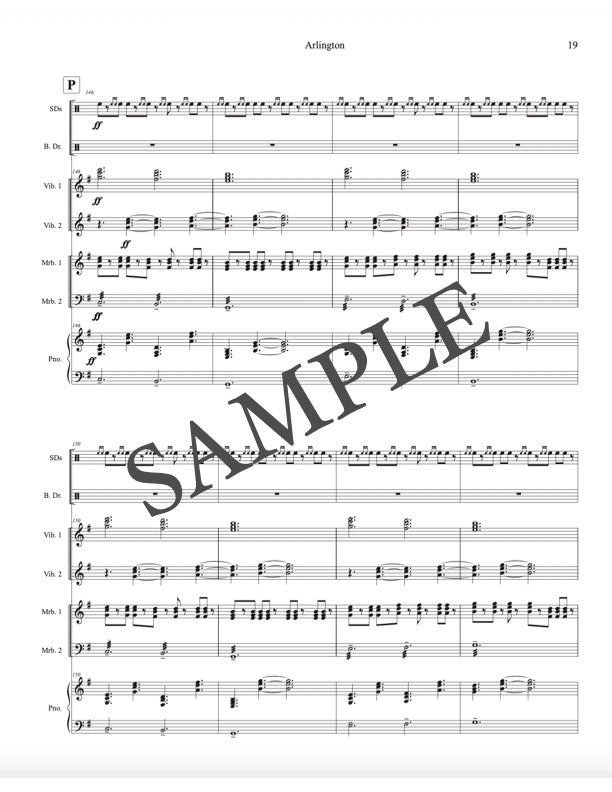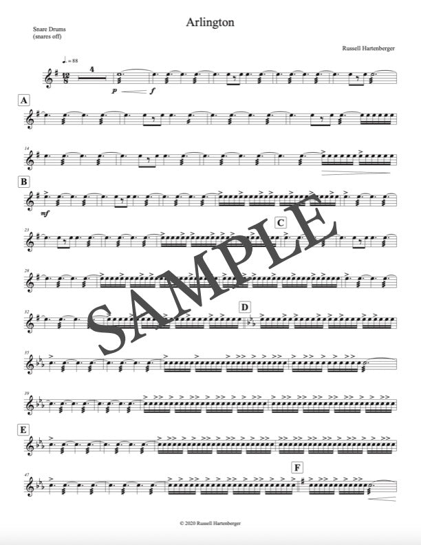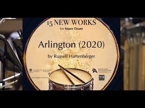 Arlington (2020) is for solo snare drum with percussion ensemble accompaniment. The piece is framed around two rhythms that are used in combination with one another. One is a drum beating that is played in funerals at Arlington National Cemetery and was played at the funeral of President John F. Kennedy. The second outlines the rhythm of a drum beating that was performed as an invocation at the opening of the World Drums concerts at Expo 86 in Vancouver by First Nations drummer Marc Aliskaswa. The snare drum part also incorporates timeline patterns from West African drum ensemble music as well as traditional North American rudimental drumming styles. There is a concept in West African music called melorhythm in which rhythms suggest melodies; this is how many of the melodic figures in Arlington are derived. Some of the other melodic and harmonic elements are references to music by J. S. Bach and Steve Reich. Arlington was commissioned by Ryan Scott as part of his 21stC Canadian Snare Drum project — Russell Hartenberger