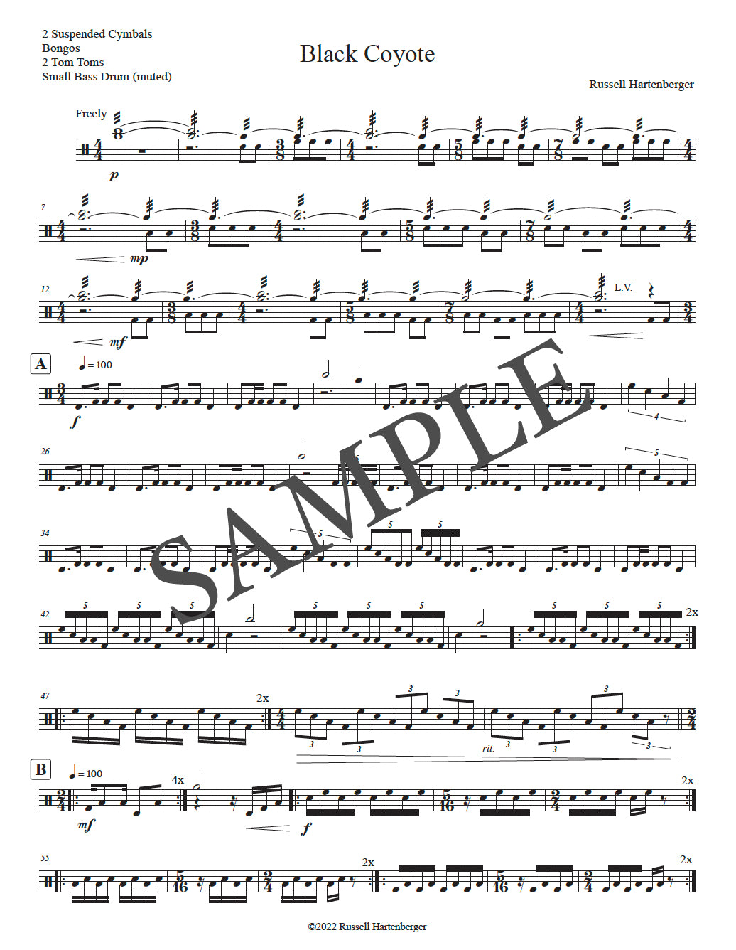 Black Coyote is a multi-percussion solo by Russell Hartenberger scored for two suspended cymbals, bongos, two tom toms, and a small, muted bass drum. The work was commissioned by and is dedicated to Morris Palter and is the first work of Hartenberger's to be published via Liquidrum Publishing.
