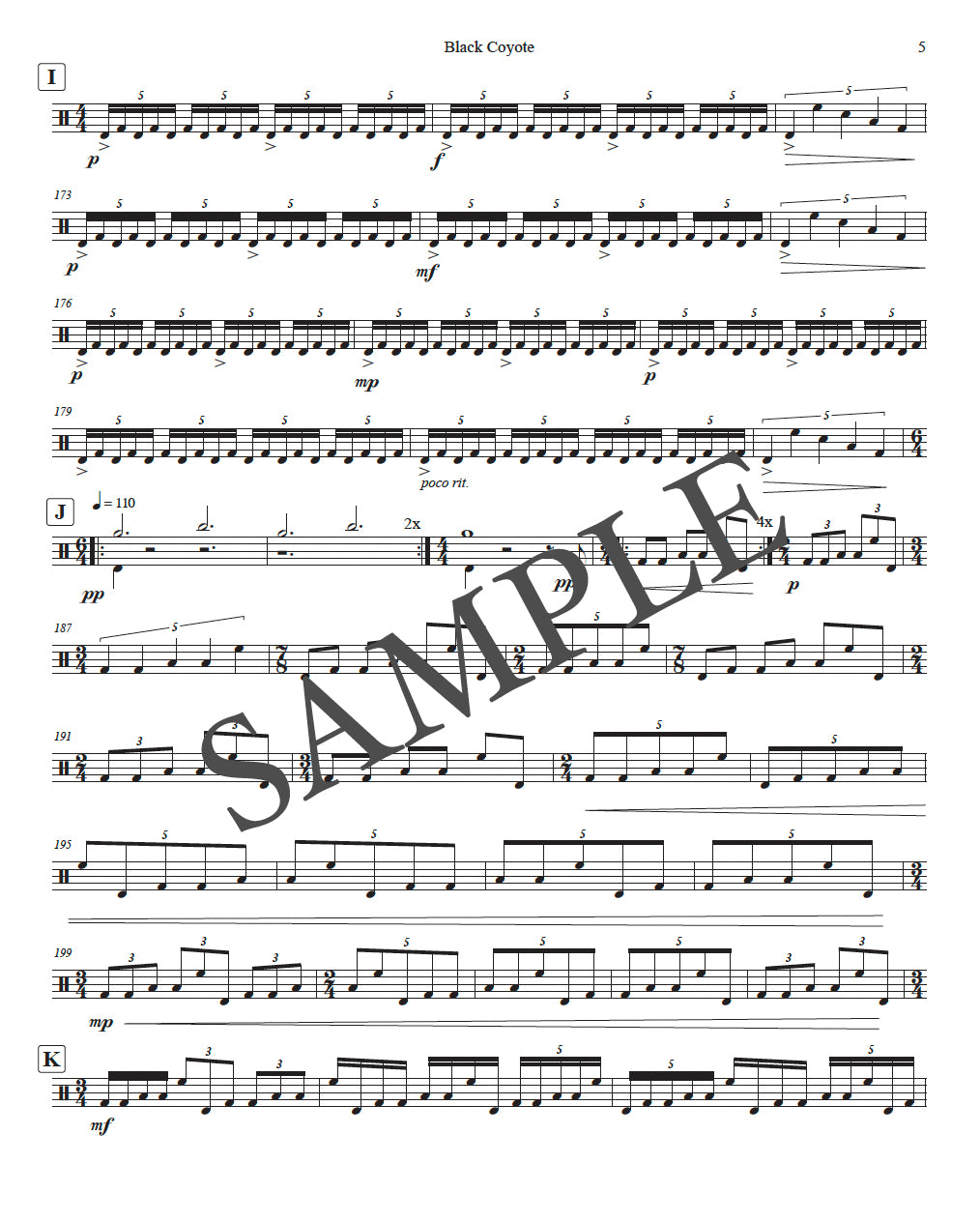 I also use some non-Western rhythmic elements in Black Coyote. There are some structural techniques borrowed from South Indian rhythmic theory that were taught to me by Ramnad V. Raghavan and Trichy Sankaran. There are also West African rhythms and techniques that I learned from the great Ghanaian master drummer, Abraham Adzenyah. The tempo changes are inspired by the beautiful tempo variations in gamelan music that I learned while playing in a Javanese gamelan directed by Prawotosaputro — Russell Hartenberger.