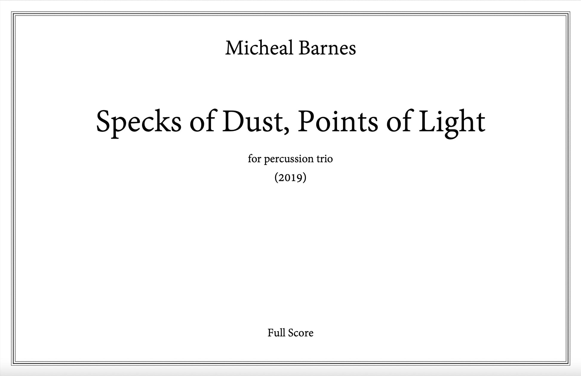 Specks of Dust, Points of Light is written and dedicated to my teacher, Jim Culley. This piece was inspired by Psalm 8 and my time spent at the University of Cincinnati College-Conservatory of Music. It reflects a shift of my aesthetic approach to music during that time — Micheal Barnes.