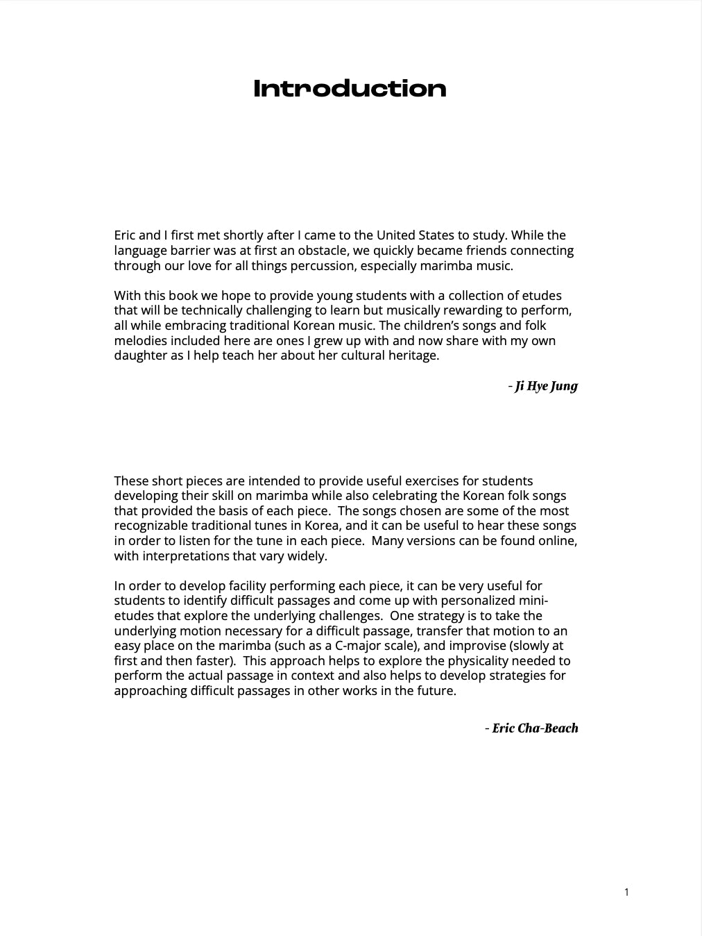 Korean Songs for Marimba is an incredible collection of two and four mallet solo marimba etudes celebrating and embracing traditional Korean music. Arranged by percussion superstars, Ji Hye Jung and Eric Cha-Beach, this book of ten etudes is a fantastic new addition to the marimba repertoire. Specifically written with students in mind, these short, intermediate etudes are perfect for young, developing marimbists.