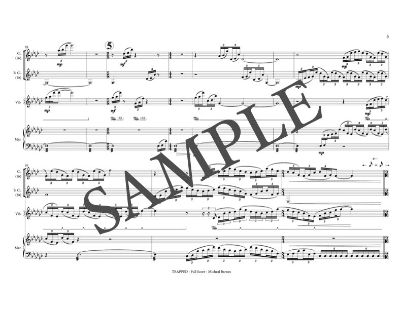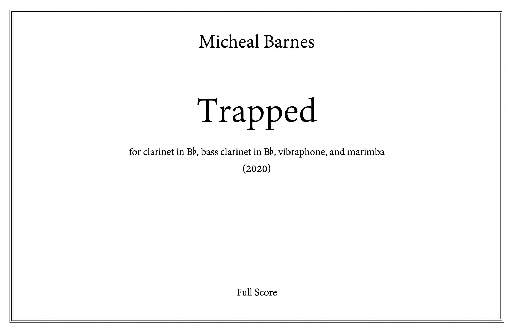 Trapped was written in the summer of 2020 during the COVID-19 pandemic. It was commissioned by Ricardo A. Coelho de Souza. This piece explores the general feeling of the political climate of that time and the pandemic experience. Due to the state mandated lockdowns, many people felt socially, economically, and spiritually isolated; everyone was trapped in one way or another. But a message of hope, literally spelled out in morse code, shifts the mood of the music and questions whether we were truly trapped — Micheal Barnes.